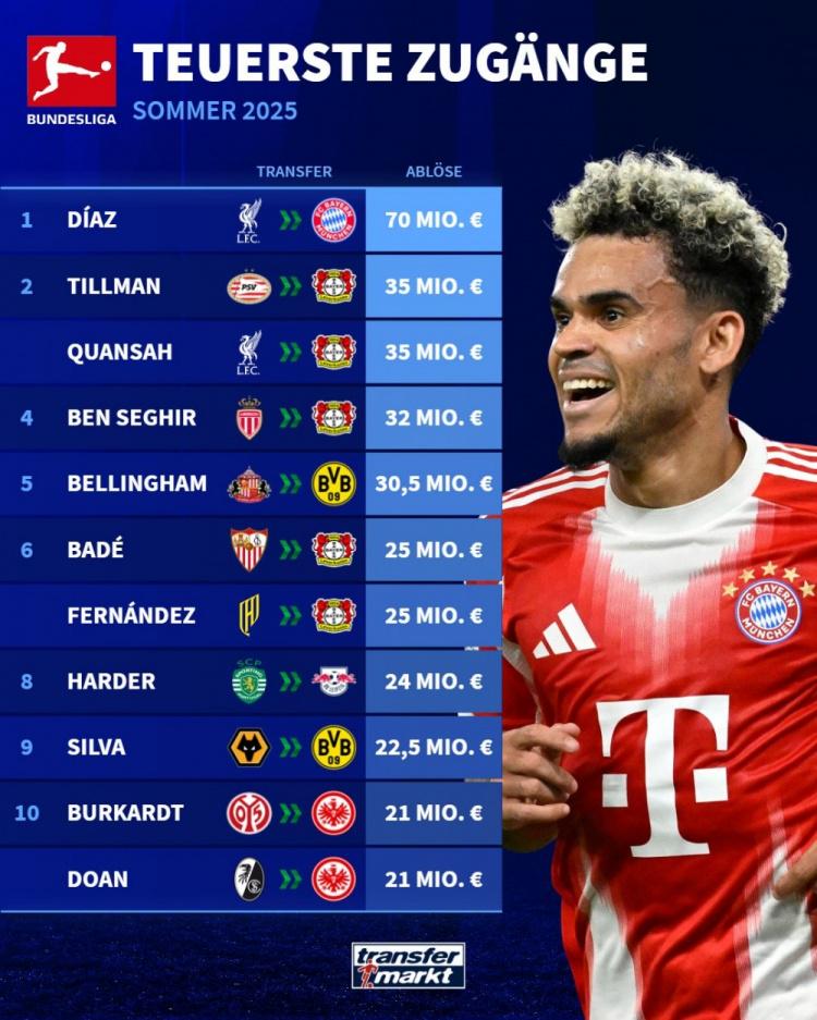 直播吧9月4日讯 德甲夏窗已经截止点点盈,《转会市场》也统计了德甲今夏的最贵引援榜,路易斯-迪亚斯断崖领跑。